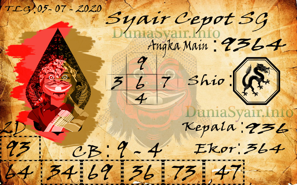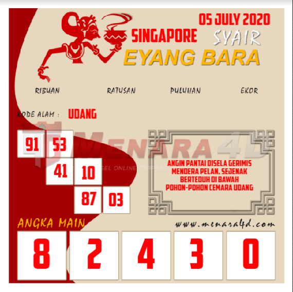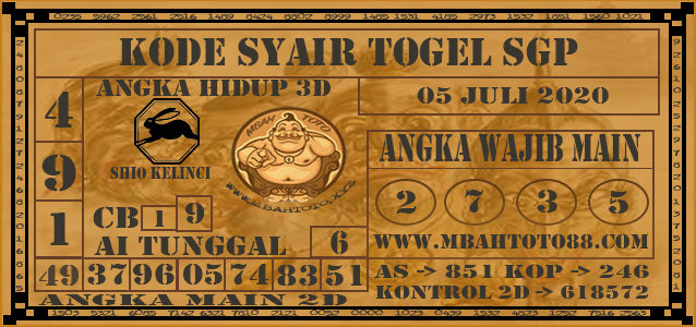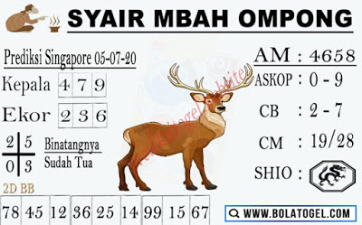 Dalam meracik Prediksi Togel Singapura Minggu 5 Juli 2020, tim prediktor juga mengambil referensi dari beberapa syair togel ternama yang banyak dicari oleh kalangan pemain togel, referensi syair togel tersebut diantaranya syair kang prabu, syair kampleng, syair mbah semar, syair naga mas, syair pandawa, syair petruk, syair sentana, syair eyang bara, syair pak cik china, syair ratu, syair hanoman, syair pendekar koi, syair cepot SD, syair wayang thai dan masih banyak lagi lainnya.