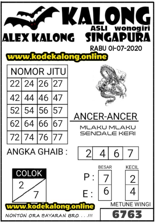 Prediksi Togel Singapura 1 Juli 2020 yang diterbitkan oleh Paitoonline.com diracik oleh para master prediktor togel dengan menggunakan rumus togel singapura yang telah teruji keakuratannya dan dipadukan dengan beberapa alat prediksi seperti angka taysen, angka unsur, angka mistik (mistik lama, mistik baru, index), buku mimpi untuk mendapatkan angka togel singapura jitu setiap harinya.