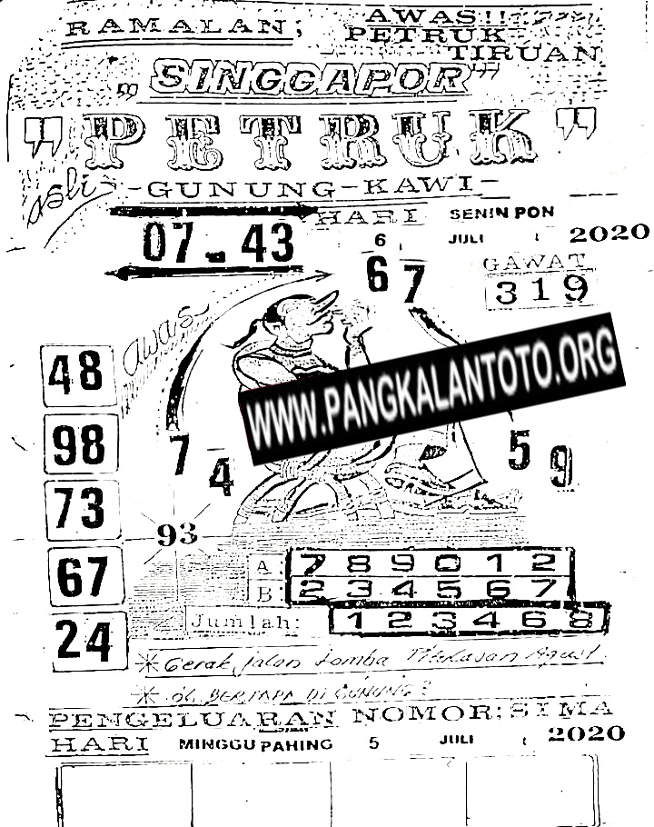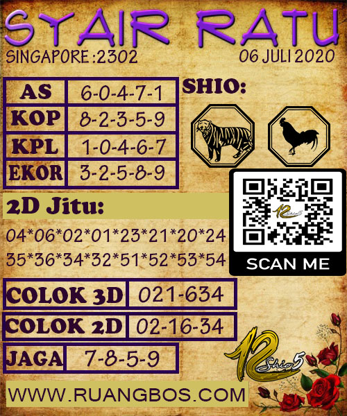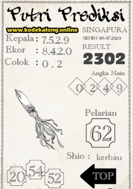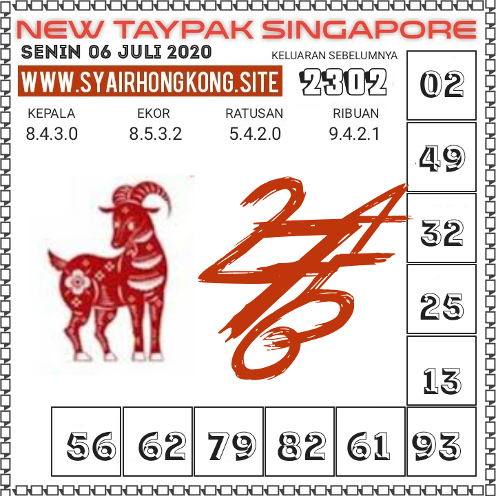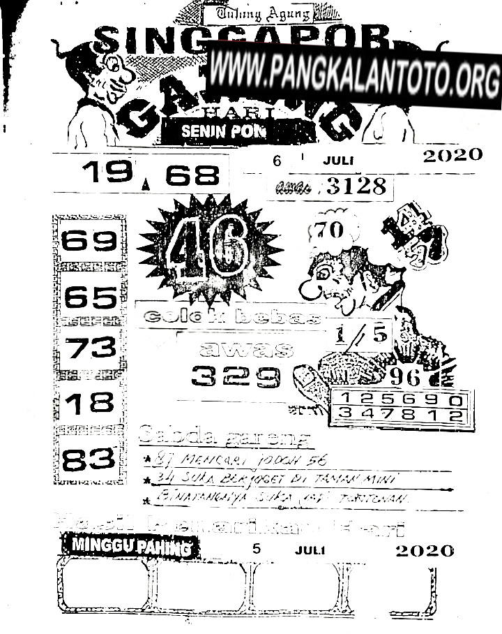 Prediksi Togel Singapura 6 Juli 2020 yang diterbitkan oleh Paitoonline.com diracik oleh para master prediktor togel dengan menggunakan rumus togel singapura yang telah teruji keakuratannya dan dipadukan dengan beberapa alat prediksi seperti angka taysen, angka unsur, angka mistik (mistik lama, mistik baru, index), buku mimpi untuk mendapatkan angka togel singapura jitu setiap harinya.