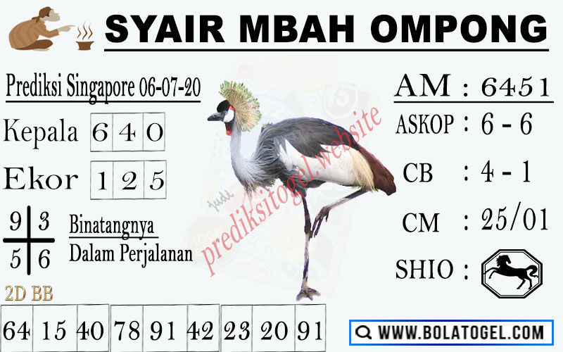 Dalam meracik Prediksi Togel Singapura Senin 6 Juli 2020, tim prediktor juga mengambil referensi dari beberapa syair togel ternama yang banyak dicari oleh kalangan pemain togel, referensi syair togel tersebut diantaranya syair kang prabu, syair kampleng, syair mbah semar, syair naga mas, syair pandawa, syair petruk, syair sentana, syair eyang bara, syair pak cik china, syair ratu, syair hanoman, syair pendekar koi, syair cepot SD, syair wayang thai dan masih banyak lagi lainnya.
